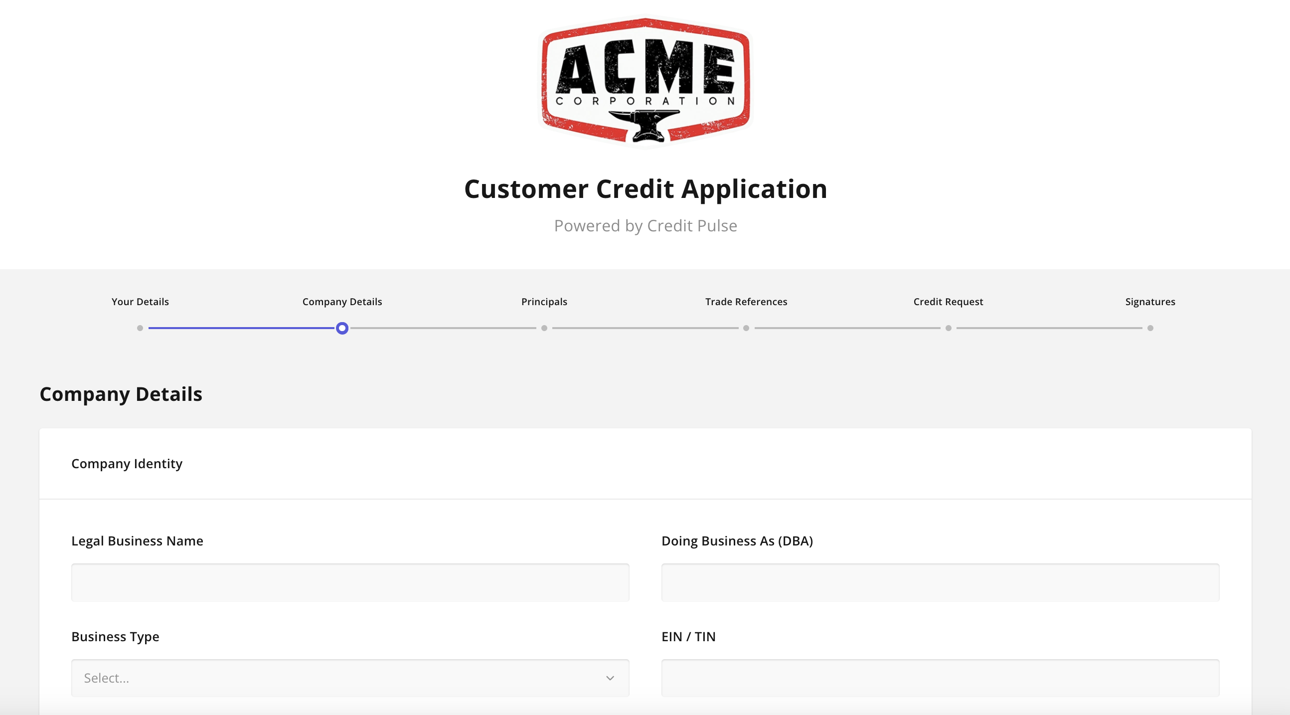 Once an application is complete, you get a consolidated view—company insights, principal checks, trade references, and credit request—all verified and ready for review.